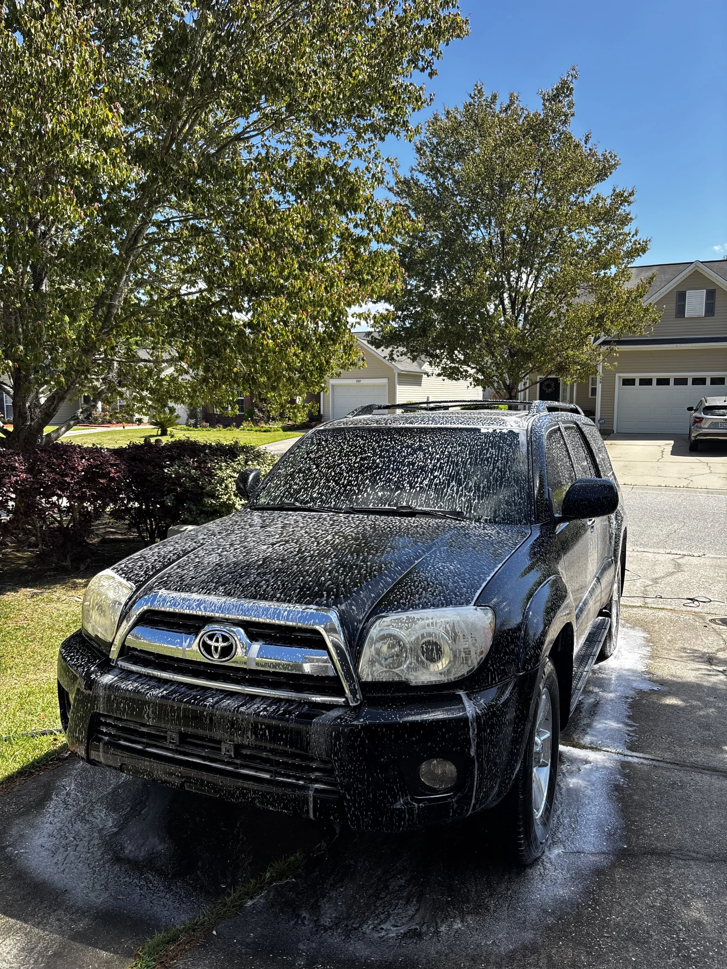 A showroom finish brought to your driveway. We hand wash the entire vehicle, apply a clay bar to remove bonded contaminants, scrub and dress the wheels and tires, clean all glass inside and out, and finish with a protective wax coat that makes the paint pop and repels water. No drive-through shortcuts — just careful, detailed work on every panel.